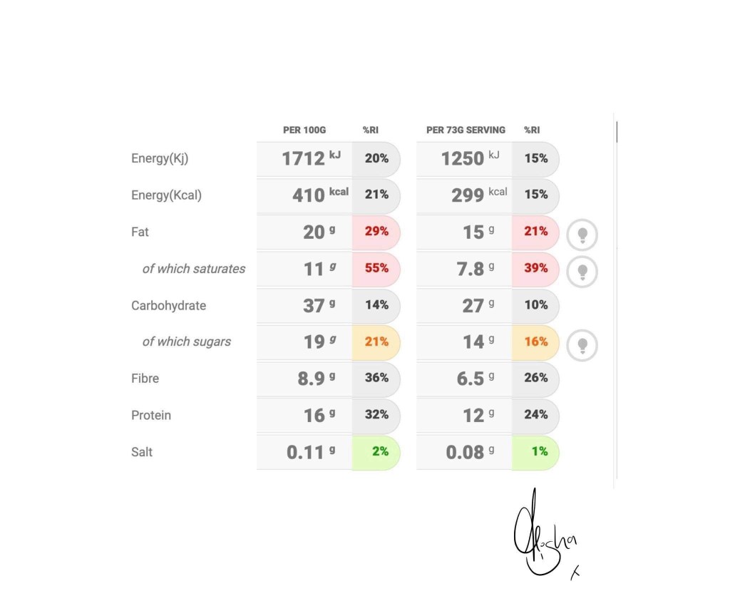 I created the nutritional value label but again, if you chop and change ingredients – they may change ever so slightly. If you need to add a drop of something else etc to change the texture, that’s perfectly okay!